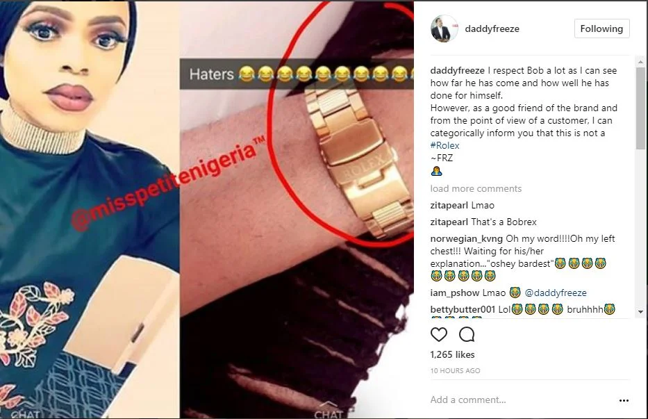 OAP Freeze has called out Popular Nigerian Cross dresser for trying to pass off a fake Rolex as the real thing. See screenshot from Insta...