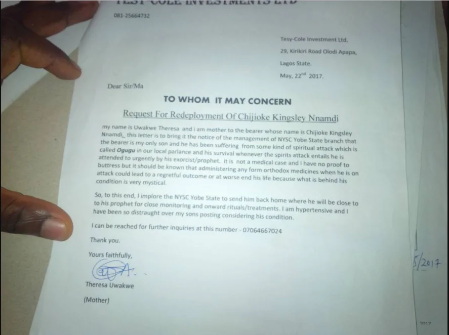 Her son, Chijioke Kingsley Nnamdi has been deployed to Yobe state for the National service. Theresa's letter implores the NYSC scheme to redeploy his son back home so he can be attended to by his exorcist/prophet.