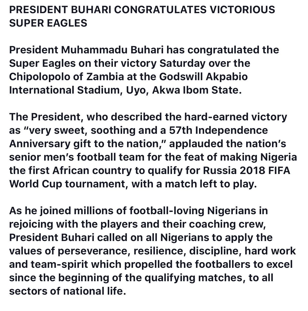 President Muhammadu Buhari has congratulated the Super Eagles for qualifying for the 2018 World Cup in Russia. See press statement bel...