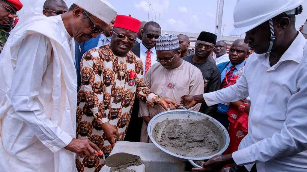 Joined by his host, Governor Dave Umahi, the President laid the foundation stone of the Rive City Tunnel and the Overhead Bridge in the city.