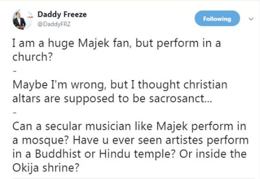 On his Twitter/Instagram page he wrote: "I am a huge Majek fan, but perform in a church?