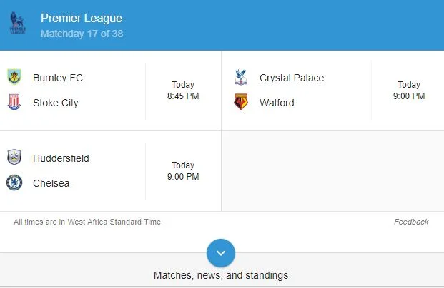 English Premier League Fixtures For Today Tuesday 12/12/2017