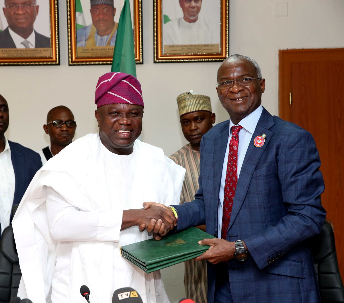 The signing of the document formally ceding ownership of the Presidential Lodge, Marina, to Lagos State Government. D...